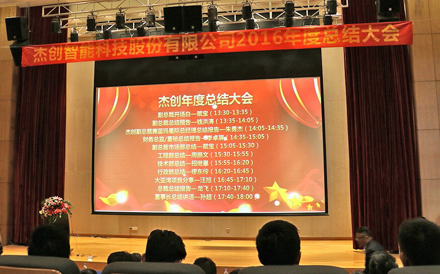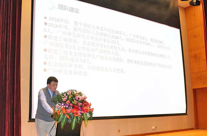 总结大会上,在公司副总裁戴宝先生激情洋溢的开场白后,副总裁钱洪涛先生、米兰电竞智能董事兼蓝玛星际总经理朱勇杰先生、财务总监兼董秘李卓屏女士、副总裁戴宝先生、工程部总监周振文先生、技术部总监招继恩先生、行政部总监缪东伶女士、工程部副总监汪旭先生、总裁龙飞先生先后登台,分别做了2016年度工作总结。